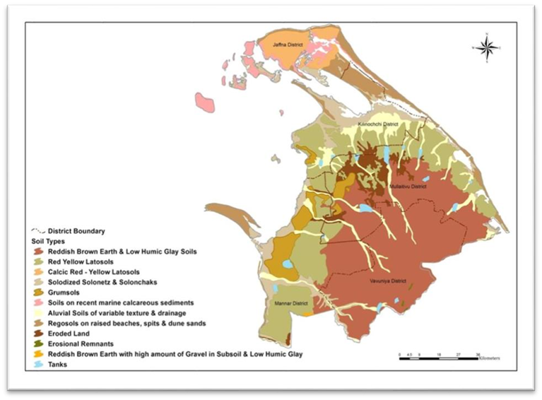 In the Northern Province, soil types vary across different regions. The Jaffna Peninsula is mainly characterized by "**Calcic red, yellow latosolic soils**", whereas the majority of the province is dominated by "**Reddish brown earth and low humic clay soils**" and "**Red yellow latosols**".<br>