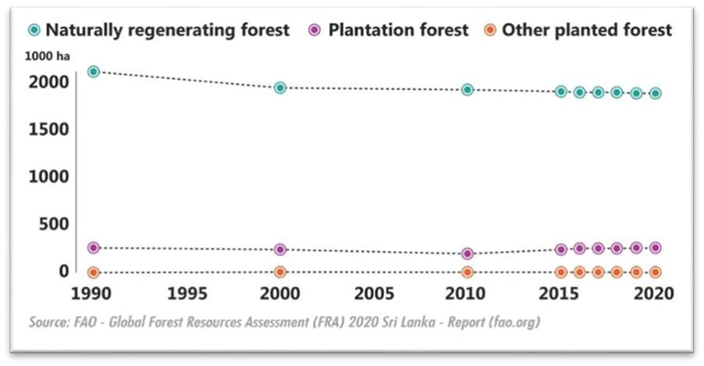 This chart clearly shows how natural forest covers were declining while plantation forests and other planted forests had no significant increase either. Overall forest cover has been declining over time. Some of the damages are irreversible. Damages done to the only remaining primary Forest in the country- “**Singharaja** “cannot be reversed. This area is home to many endemic flora and fauna hence the impact is huge.